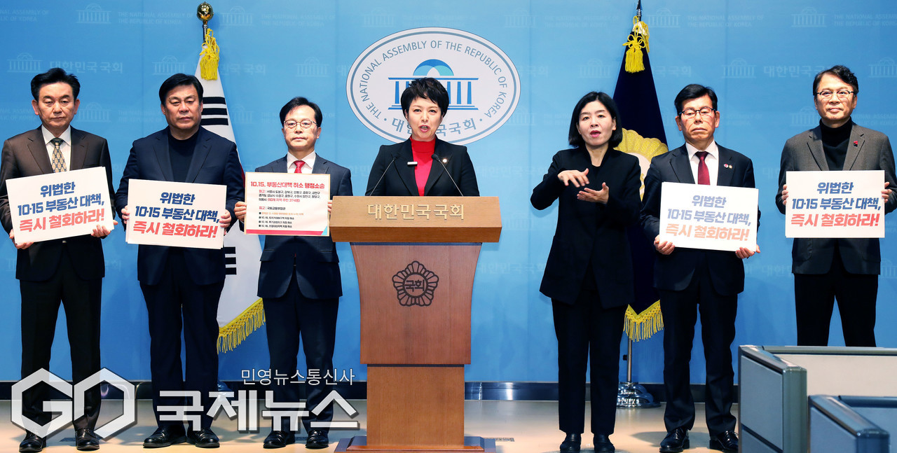 (서울=국제뉴스) 김은혜 국민의힘 원내정책수석부대표가 26일 오전 서울 여의도 국회 소통관에서 10.15 부동산 대책 행정소송 관련 기자회견을 열고 발언하고 있다./사진=이용우 기자