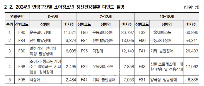 26일 건강보험심사평가원이 배포한 ‘2025년 생활 속 질병·진료행위 통계’에 의하면 지난해 7~12세 아동(초등학생)이 가장 많이 치료한 정신건강질환은 운동과다장애(상병코드 F90)로 총 8만 6797명이 진료받았다. 운동과다장애(상병코드 F90)는 일명 ADHD(주의력결핍 과잉행동장애)로 불리는 질환이다.