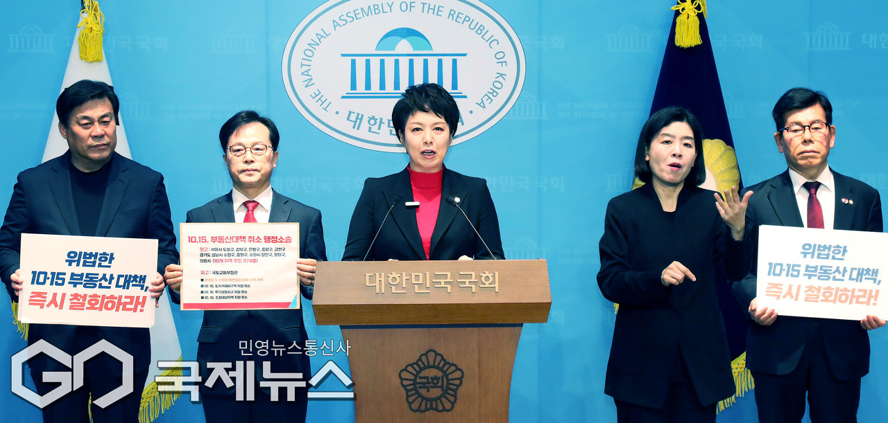 (서울=국제뉴스) 김은혜 국민의힘 원내정책수석부대표가 26일 오전 서울 여의도 국회 소통관에서 10.15 부동산 대책 행정소송 관련 기자회견을 열고 발언하고 있다./사진=이용우 기자