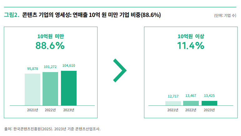 콘텐츠 기업의 영세성도 투자 활성화를 가로막는다. 2023년 기준 콘텐츠 기업의 88.6%가 연매출 10억 원 미만이다. 기업 단위의 재무 안정성이나 성장 스토리를 제시하기 어렵다 보니, 투자는 대기업 계열이나 플랫폼 중심으로 쏠릴 수밖에 없다.