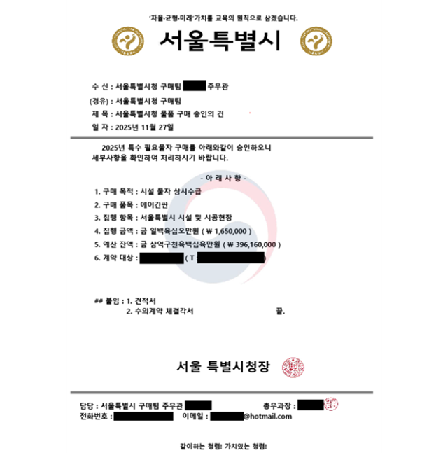 26일 서울시가 공개한 '시 공무원 사칭' 위조 공문. 서울시 제공 |