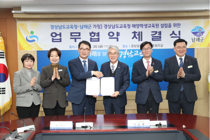 경상남도교육청은 26일 본청에서 남해군과 경상남도교육청 학생교육원 남해분원을 증·개축해 가칭 경상남도교육청 해양학생교육원 설립하기 위한 업무협약을 체결했다고 밝혔다. 이번 협약식에는 박종훈 교육감과 장충남 남해군수가 참석했다.