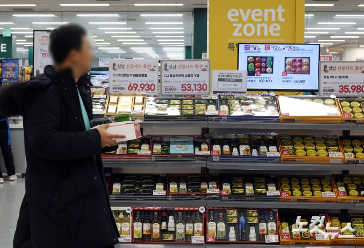 대형마트가 내년 설을 앞두고 선물세트 사전예약에 본격적으로 돌입한 26일 서울 이마트 영등포에 시민들이 선물세트를 둘러보고 있다. 이마트는 26일부터 내년 2월 6일까지 설 선물세트 사전예약 프로모션을 진행한다.