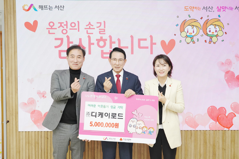 충남 서산시는 24일 ㈜디케이로드가 지역내 어려운 이웃을 돕기 위한 성금 500만원을 기탁했다고 밝혔다.