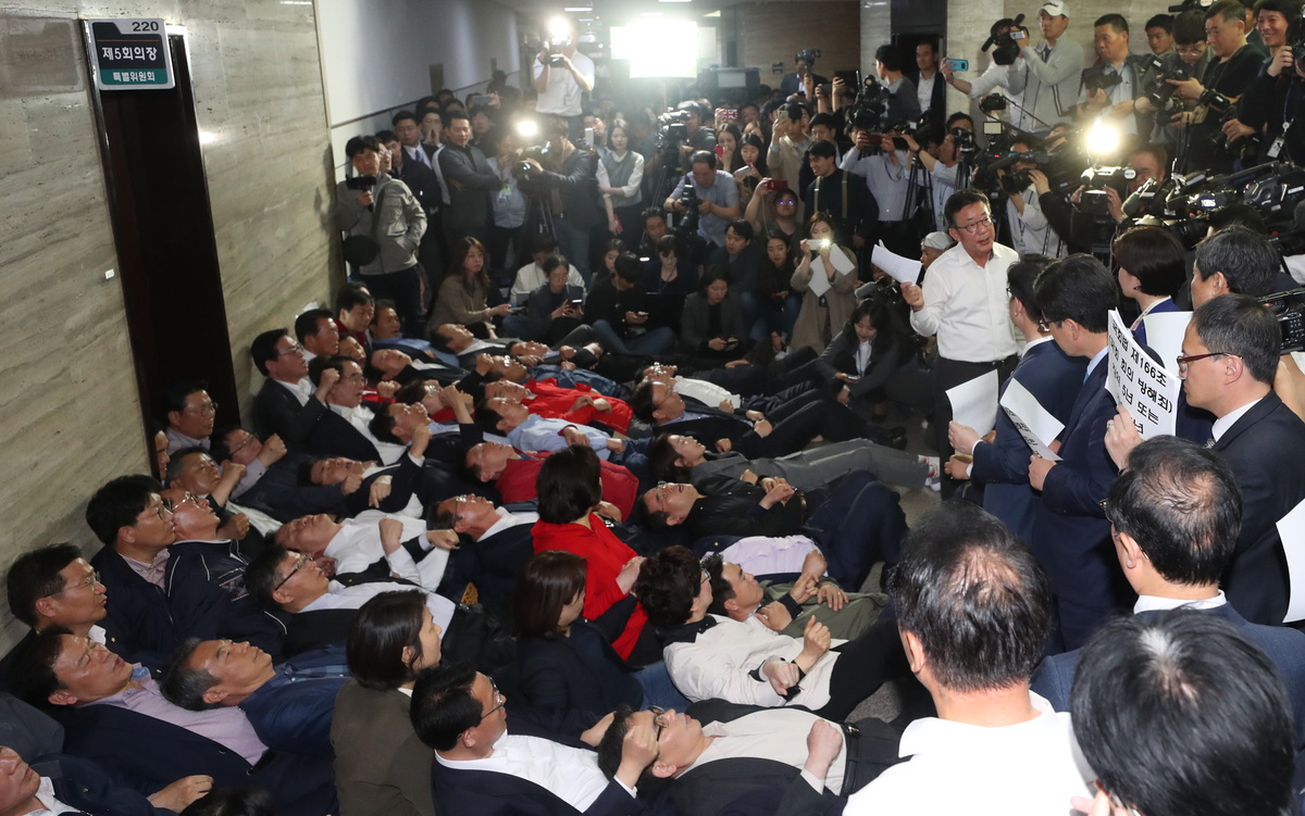 어깨 걸고 드러누운 자유한국당 자유한국당(현 국민의힘) 의원들이 2019년 4월26일 밤 국회에서 더불어민주당 등 여야 4당이 ‘공수처법’ 패스트트랙 처리를 위해 사법개혁특위 개의를 시도하자 회의실 앞에 드러누워 이상민 위원장 등 참석자의 진입을 막고 있다. 연합뉴스 |