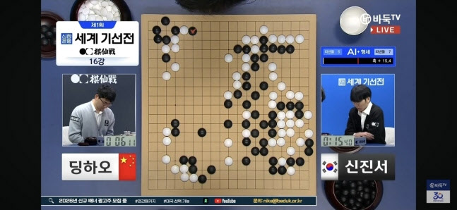 끌려가는 형세가 된 딩하오는 상변에 큰 모양을 만들며 반전을 꾀했다. 신진서는 우변에서 다시 패를 걸어 승기를 잡았다. 인공지능(AI) 예상 승률도 99%를 넘어서며 사실상 승패가 갈렸다. 딩하오는 몇 수를 더 뒀으나 결국 돌을 던졌다.
