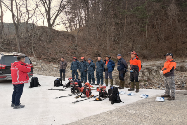 ▲작업자들이 예방나무주사 작업에 앞서 안전 교육을 받고 있다ⓒ울진군청 |