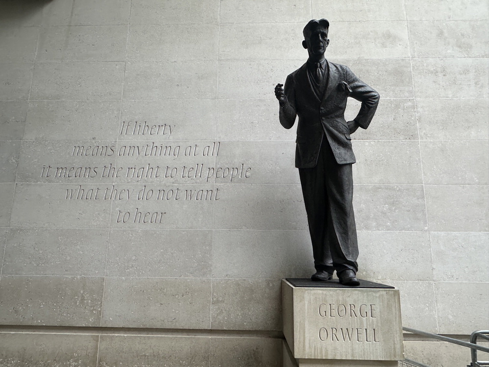영국 BBC 본사에 설립된 조지 오웰의 동상. 오웰은 BBC에서 근무했고 전체주의를 비판한 세계적인 작가였다. 조각상 벽면에는 "자유가 뭔가 의미를 가진다면, 그것은 사람들이 듣고 싶어 하지 않는 것을 말할 권리이다"라고 적혀 있다. Matt Brown |