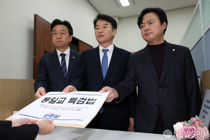 [서울=뉴스핌] 정일구 기자 = 더불어민주당 이용우 원내부대표(왼쪽부터), 문진석 원내운영수석부대표, 김현정 원내대변인이 26일 오후 서울 여의도 국회에서 통일교 특검법안을 의안과에 제출하고 있다. 2025.12.26 mironj19@newspim.com