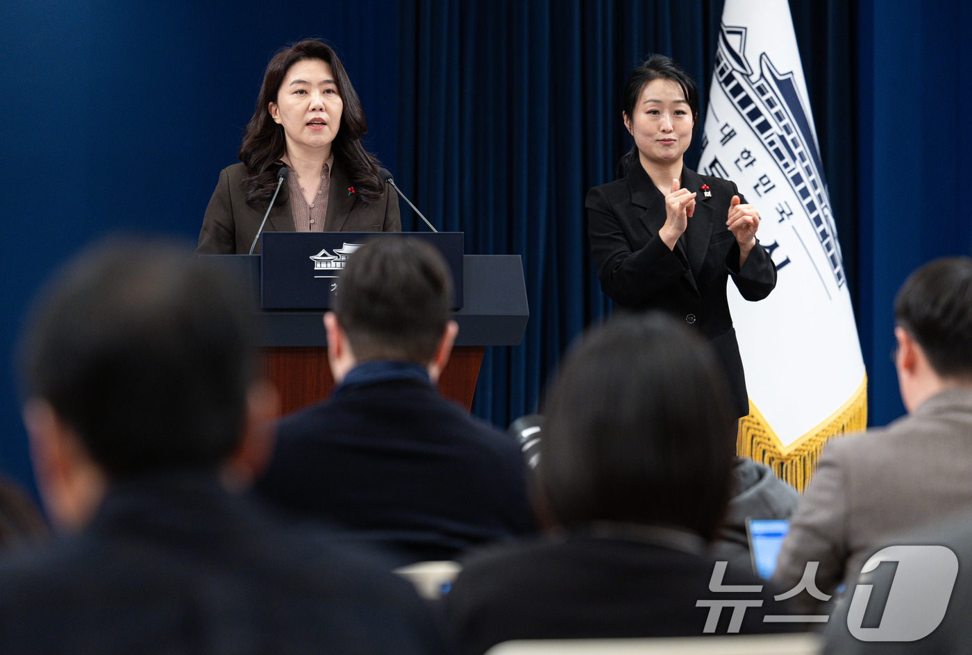 (서울=뉴스1) 이재명 기자 = 강유정 대통령실 대변인이 26일 청와대 춘추관에서 위험직무 순직 유가족 초청 오찬 관련 브리핑을 하고 있다. 2025.12.26/뉴스1