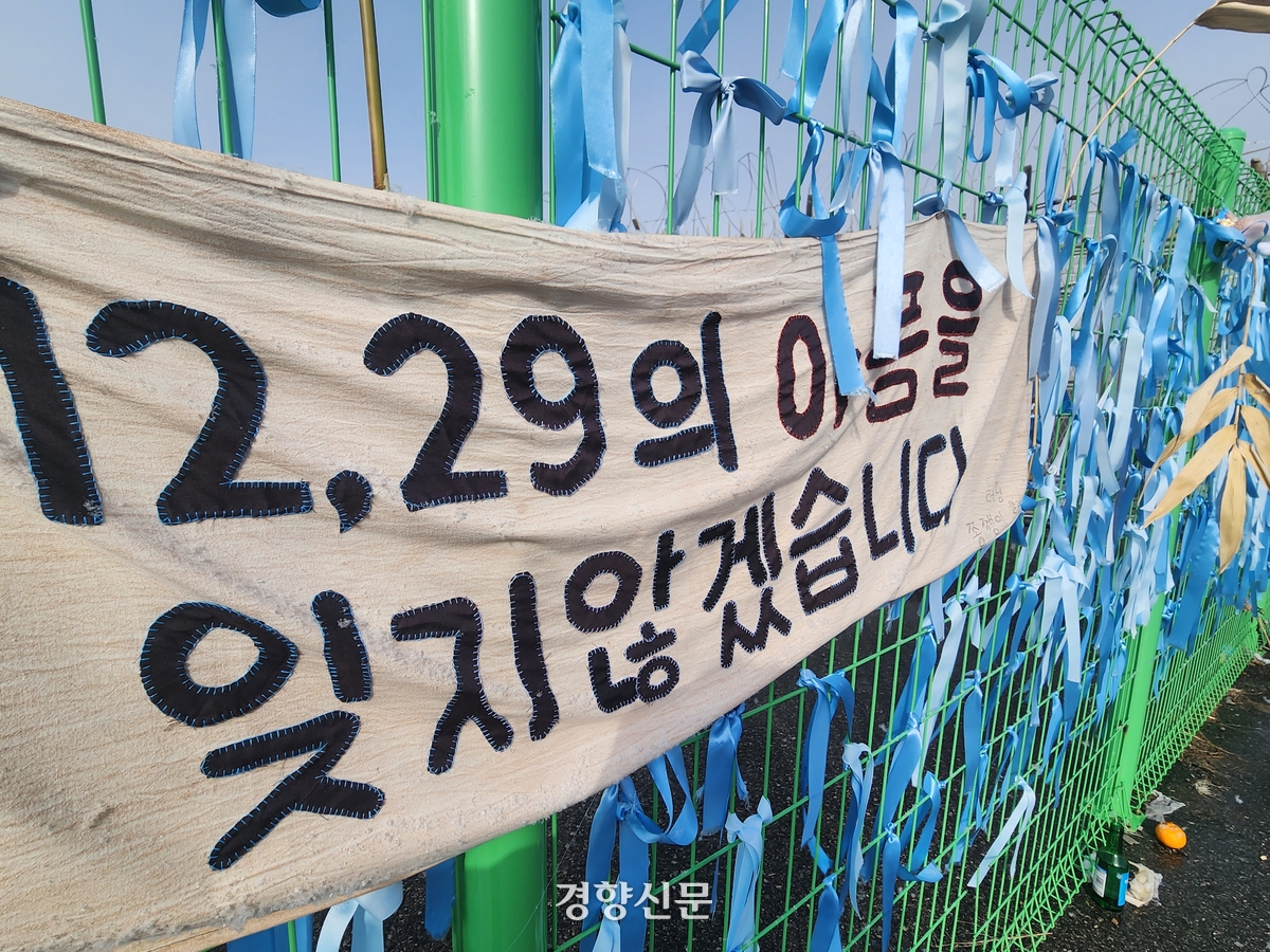 ‘12·29 무안공항 제주항공 여객기 참사’ 1주기를 앞둔 26일 무안국제공항 활주로 외곽 펜스에는 “아픔을 잊지 않겠다”는 다짐이 적힌 현수막과 파란색 추모 리본이 내걸려 있다. 고귀한 기자 |