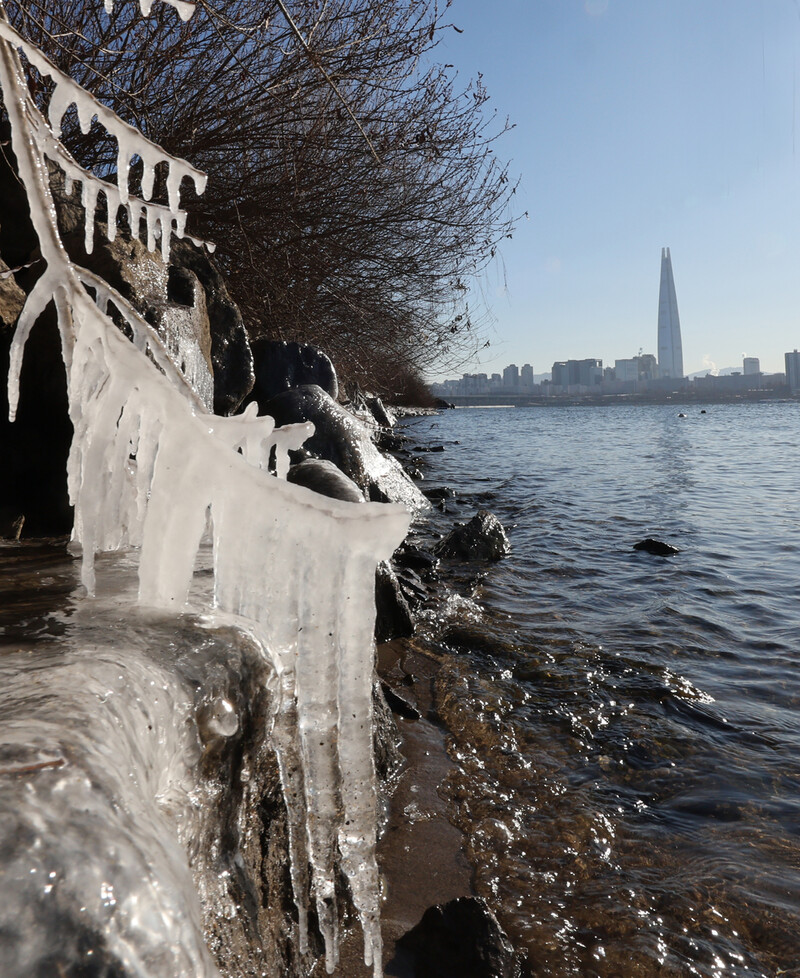 올겨울 첫 한파경보가 내려진 26일 서울 광진구 한강 주변에 얼음이 얼어있다. 연합뉴스 |
