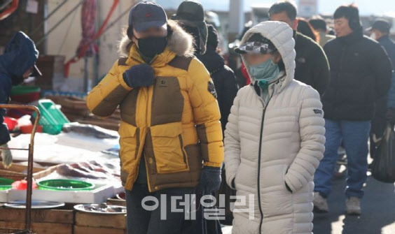 경남 창원시 마산합포구 마산어시장에서 두꺼운 패딩 점퍼 등을 착용한 시민이 찬 바람을 막으며 이동하고 있다. (사진=연합뉴스) |