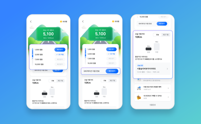 신규 서비스는 홈 화면에서 ‘만보기 시작하기’를 누르면 이용 가능하다. 앱을 켜두지 않아도 휴대폰 센서와 건강 앱 연동을 통해 걸음 수가 자동 기록된다.