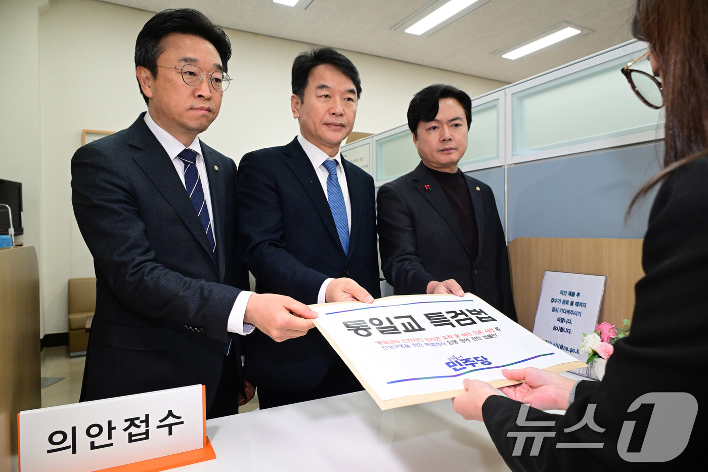 문진석 원내수석부대표와 이용우 법률위원장, 김현정 원내대변인은 이날 오후 국회 의안과를 찾아 김병기 원내대표 명의로 대표 발의한 '통일교와 신천지의 정치권 유착 및 비리 의혹 사건 등 진상규명을 위한 특별검사 임명 등에 관한 법률안'을 제출했다.