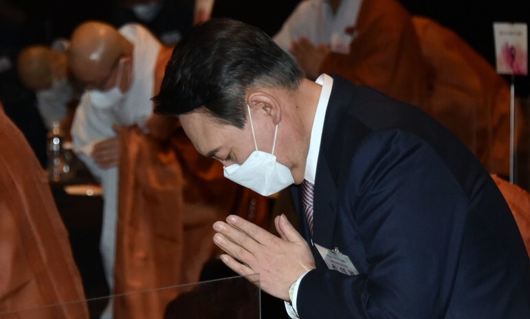 당시 국민의힘 윤석열 대선 후보가 2022년 1월17일 오후 서울 중구 신라호텔에서 열린 불교리더스포럼 제5기 출범식에 참석해 합장하고 있다. 국회사진기자단 |