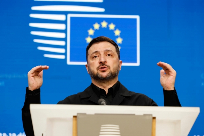 볼로디미르 젤렌스키 우크라이나 대통령이 18일(현지 시간) 벨기에 브뤼셀에서 열린 유럽연합(EU) 정상회의 중 기자회견하고 있다./AP=뉴시스 |