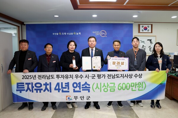 무안군이 전라남도 투자유치 우수시군에 선정돼 기념촬영을 하고 있다. ⓒ무안군 (포인트경제) |