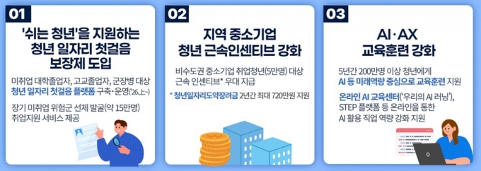 일자리 분야에서는 '첫 일자리'와 '다시 서기' 지원에 방점을 찍는다. 이에 따라 청년을 신규 채용하는 기업에는 민관 협의체를 통해 재정, 세제, 포상 혜택 등 인센티브를 제공한다. 국가 연구개발(R&D) 분야 청년 채용 확대를 위해 국비지원 기업 R&D 수행 시 청년고용 우대도 검토한다.