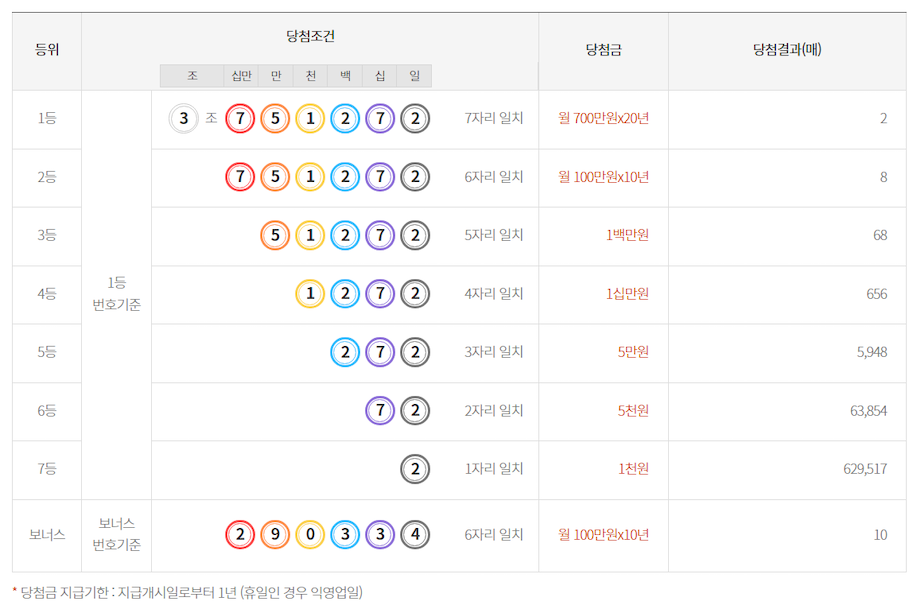 월 700만원을 20년간 받는 1등 당첨자는 2매다.