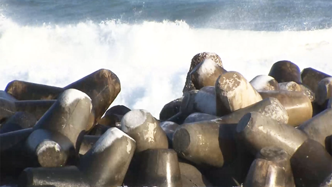 바닷가 테트라포드와 갯바위 표면이 하얗게 변했습니다.