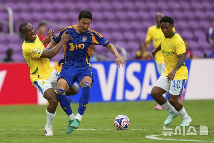 [올랜도=AP/뉴시스] 울산 현대의 정우영(가운데)이 17일(현지 시간) 미 플로리다주 올랜도 인터앤코 스타디움에서 열린 2025 국제축구연맹(FIFA) 클럽 월드컵 F조 조별리그 1차전 마멜로디 선다운스(남아공)와의 경기 중 공을 다투고 있다. 울산은 전반 36분 실점하며 0-1로 전반을 마쳤다. 2025.06.18. |