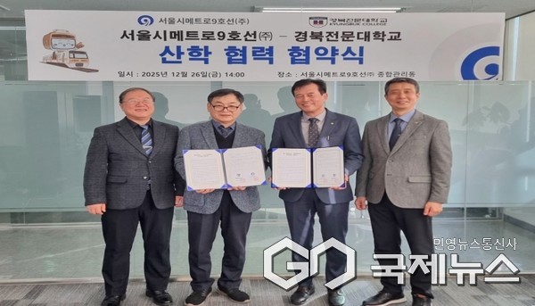 (영주=국제뉴스) 백성호 기자 = 경북전문대학교(총장 최재혁) 철도전기기관사과는 12월 26일 서울시메트로9호선(주) 종합관리동에서 산학협력 협약을 체결했다.