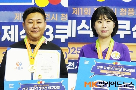 ‘제1회 제천시 청풍호배 전국3쿠션대회’ 동호인부 개인전에서 김동준(SM빌리어드)과 김규원(당나라)이 생활체육선수(동호인) 남녀 3쿠션 최강조(A조) 정상에 올랐다.
