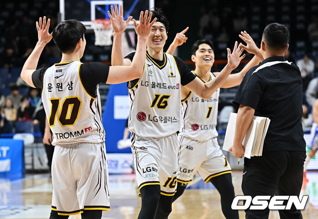 창원 LG 유기상과 정인덕이 2번째 연장에서 리드폭 늘리는 3점슛을 성공시킨 윤원상과 포효하고 있다. 2025.12.26 / foto0307@osen.co.kr