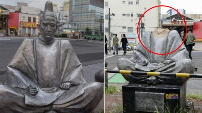 일본 나고야 거리에 설치된 도요토미 히데요시 동상의 목 부분이 훼손됐다. 왼쪽은 훼손 전 멀쩡했던 모습. /사진=SNS 갈무리 |