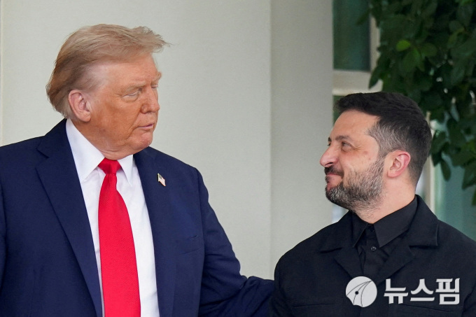 도널드 트럼프 미국 대통령이 2025년 8월18일 백악관에서 볼로디미르 젤렌스키 우크라이나 대통령을 맞고 있다. [사진=로이터 뉴스핌] |