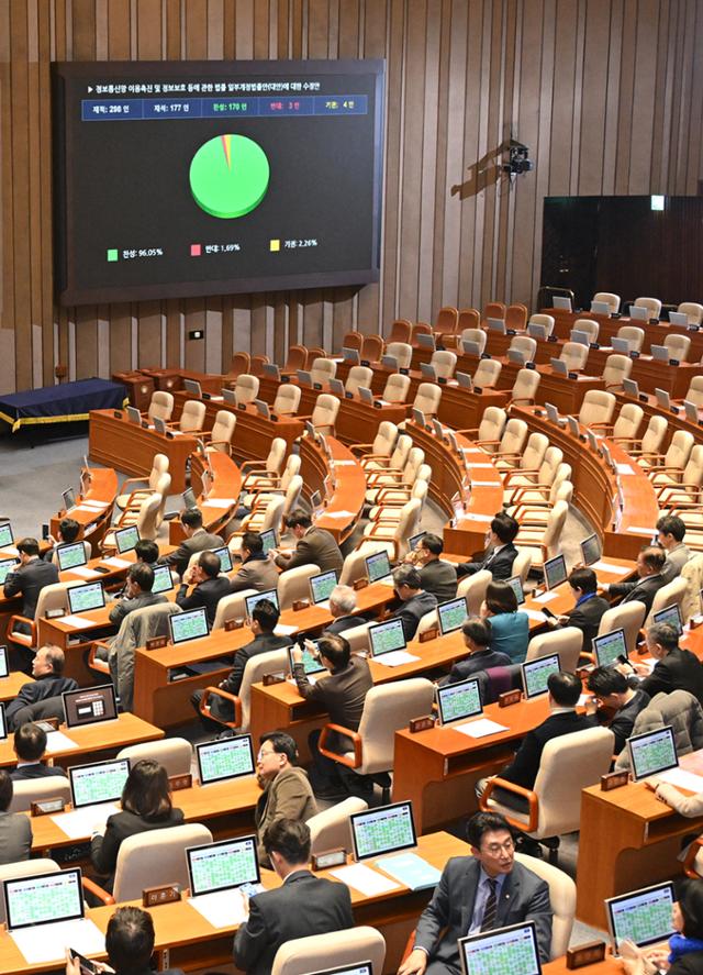 24일 국회 본회의에서 허위조작정보근절법(정보통신망법 개정안)이 국민의힘이 표결에 불참한 가운데 더불어민주당 주도로 통과되고 있다. 민경석 기자 |