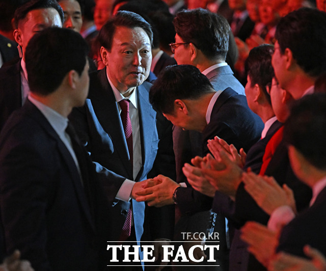 당대표 선거 지원 대가로 김건희 여사에게 명품 가방을 건넨 의혹을 받는 김기현 국민의힘 의원의 배우자가 김 여사 연루 의혹들을 수사하는 민중기 특별검사팀에 두번째 출석했다. 사진은 2023녀 3월8일 경기 일산 킨텍스에서 열린 국민의힘 제3차 전당대회에서 인사를 나누는 윤석열 전 대통령과 김기현 의원 /더팩트 DB |