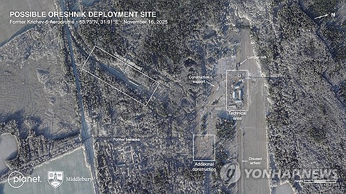 (서울=연합뉴스) 오수진 기자 = 러시아의 신형 극초음속 중거리 탄도 미사일 '오레시니크'가 인접국 벨라루스의 옛 공군기지에 배치된 것으로 보이는 정황이 포착됐다.