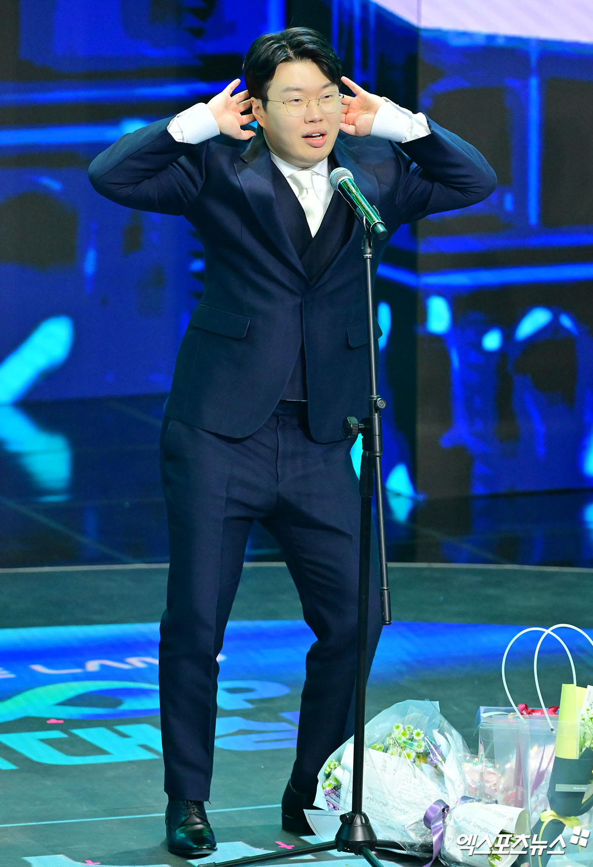 (엑스포츠뉴스 상암, 김한준 기자) 27일 오후 서울 상암 콜로세움에서 열린 '2025 SOOP 스트리머 대상' 시상식, 올해의 스트리머를 수상한 봉준이 소감을 말하고 있다.