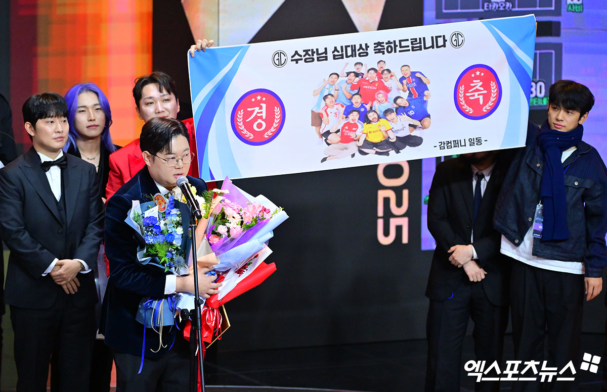 (엑스포츠뉴스 상암, 김한준 기자) 27일 오후 서울 상암 콜로세움에서 열린 '2025 SOOP 스트리머 대상' 시상식, 스포츠 스트리머 대상을 수상한 감스트가 소감을 말하고 있다.