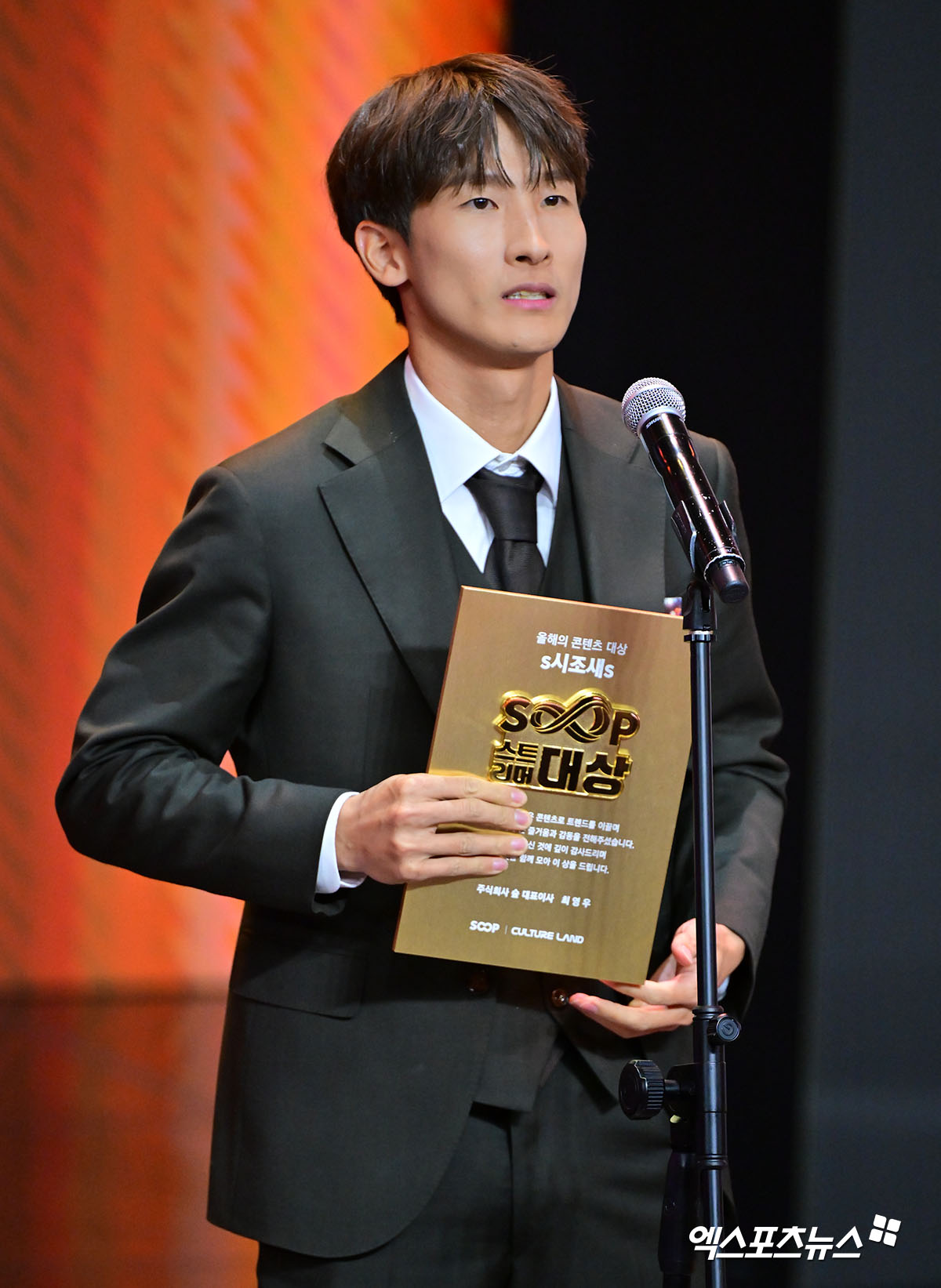 (엑스포츠뉴스 상암, 김한준 기자) 27일 오후 서울 상암 콜로세움에서 열린 '2025 SOOP 스트리머 대상' 시상식, 콘텐츠 스트리머 대상을 수상한 시조새가 소감을 말하고 있다.