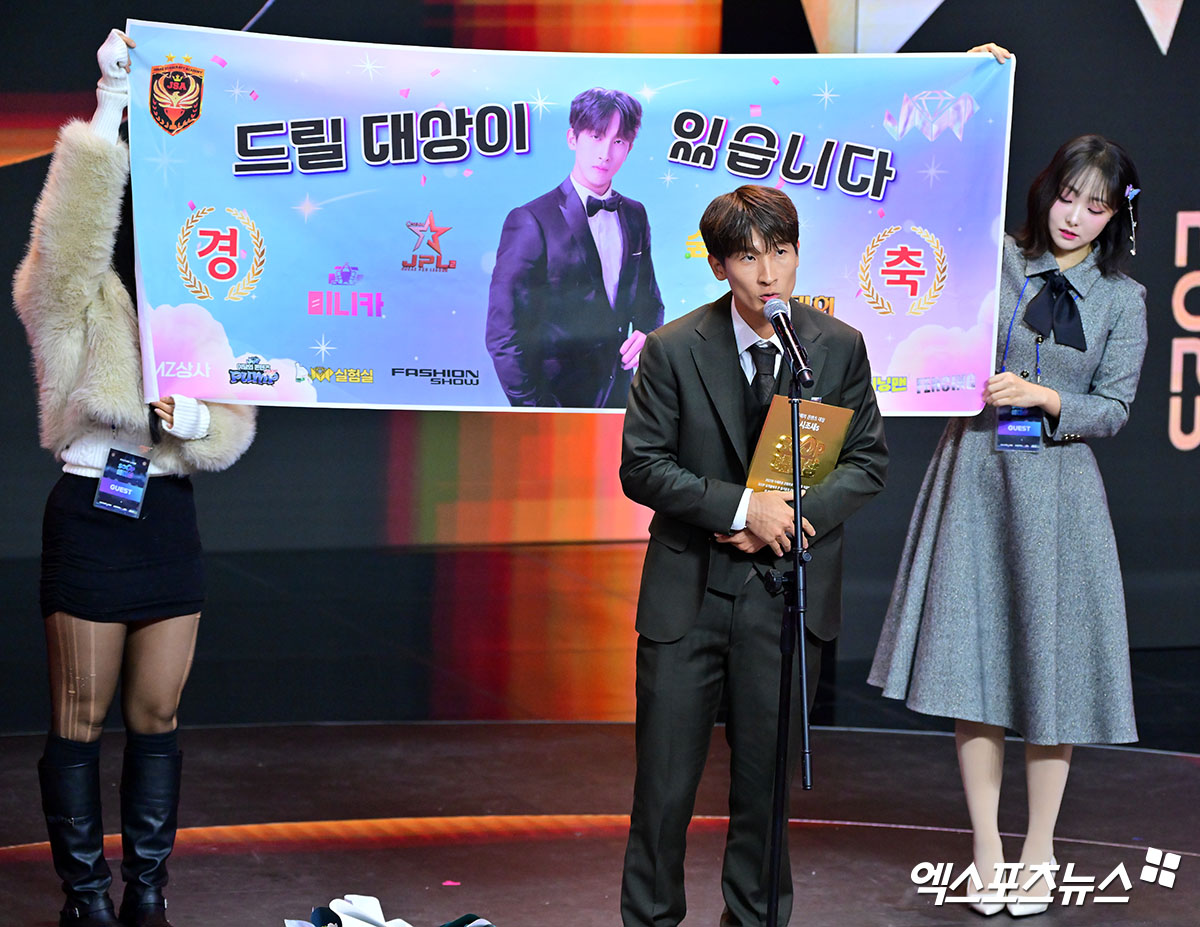(엑스포츠뉴스 상암, 김한준 기자) 27일 오후 서울 상암 콜로세움에서 열린 '2025 SOOP 스트리머 대상' 시상식, 콘텐츠 스트리머 대상을 수상한 시조새가 소감을 말하고 있다.