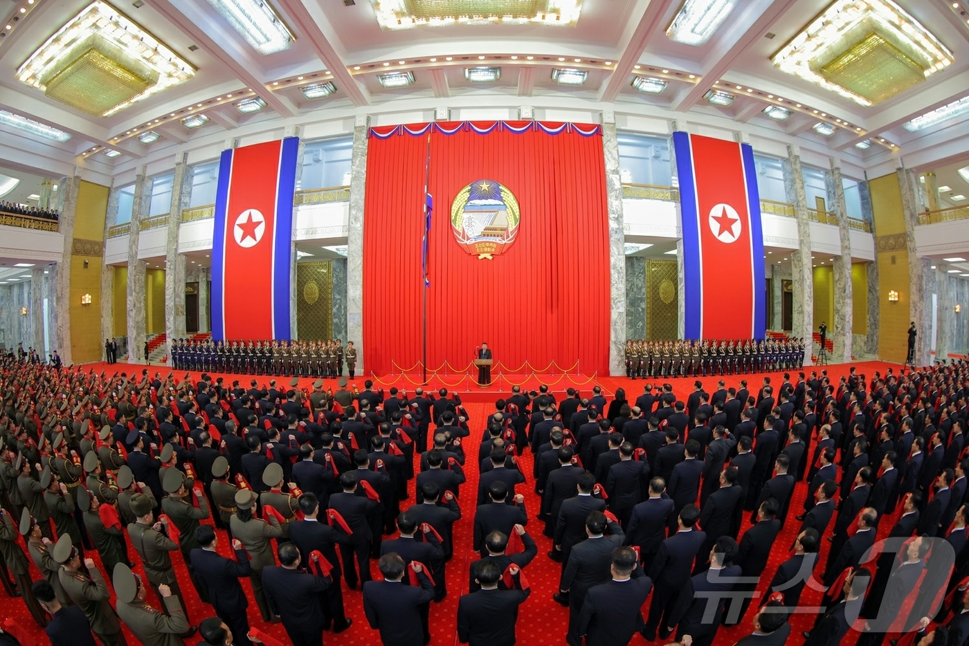 (평양 노동신문=뉴스1) = 북한 노동당 기관지 노동신문은 전날인 27일 만수대의사당에서 김정은 당 총비서의 참석 아래 헌법절 53주년을 기념하는 국기게양 및 선서의식을 진행했다고 28일 보도했다. [국내에서만 사용가능. 재배포 금지. DB 금지. For Use Only in the Republic of Korea. Redistribution Prohibited] rodongphoto@news1.kr