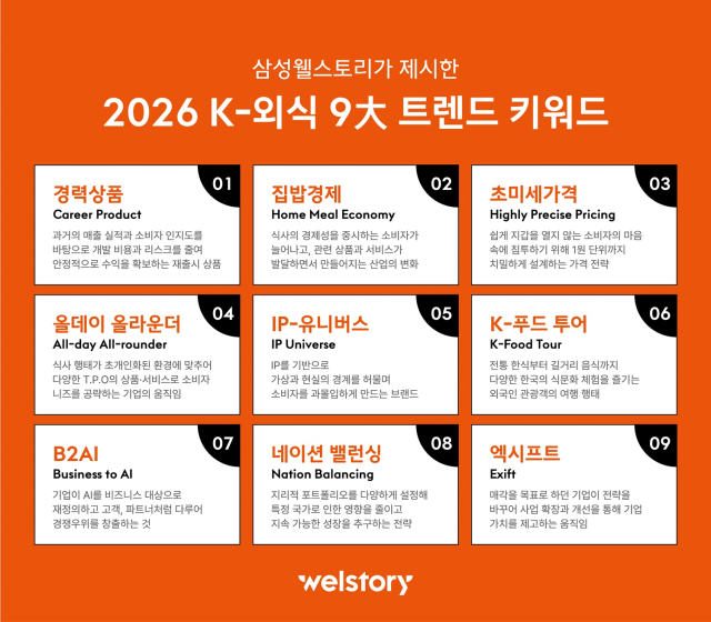 푸드투어·집밥경제·초미세 가격···삼성웰스토리, 2026 트렌드 내놔 서울경제 원문 노현영 기자 입력 2025.12.28 08:00 최종수정 2025.12.28 22:00 댓글 첫 댓글을 작성해보세요 글자 크기 변경 작게 기본 크게 가장 크게 출력하기 페이스북 공유 엑스 공유 카카오톡 공유 주소복사 주소복사가 완료되었습니다 기사로 돌아가기
