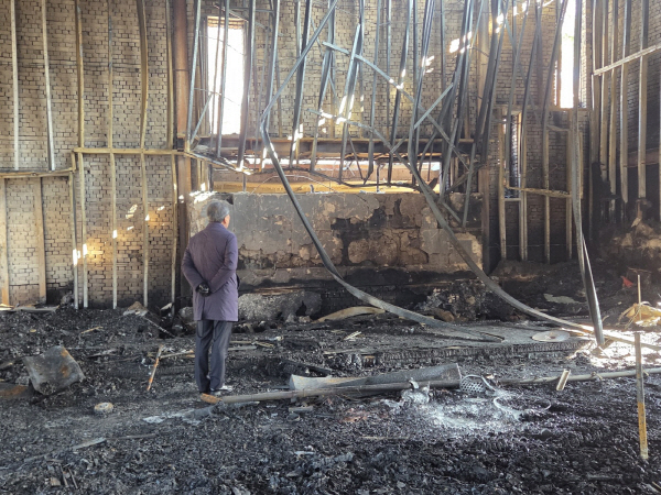 화재로 전소된 강화교산교회 예배실의 피해 현황을 살펴보는 한교총 대표회장 김정석 목사./제공=기독교대한감리회 |