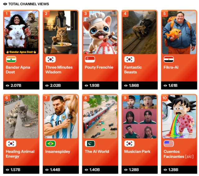 27일(현지 시간) 가디언 등 외신에 따르면 글로벌 동영상 편집 플랫폼 ‘캡윙(Kapwing)’이 상위 유튜브 채널 1만 5000개를 분석한 결과 278개 채널이 ‘AI 콘텐츠 공장’ 형태로 운영되고 있었다. 이들 채널의 누적 조회수는 630억회, 구독자 수는 2억 2100만 명을 넘어섰다.