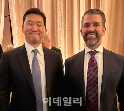 올해 1월 미국 워싱턴D.C에서 열린 도널드 트럼프 대통령 비공개 리셉션장에서 김범석(좌) 쿠팡Inc 의장이 도널드 존 트럼프 주니어와 기념촬영을 하고 있다(사진=연합뉴스) |