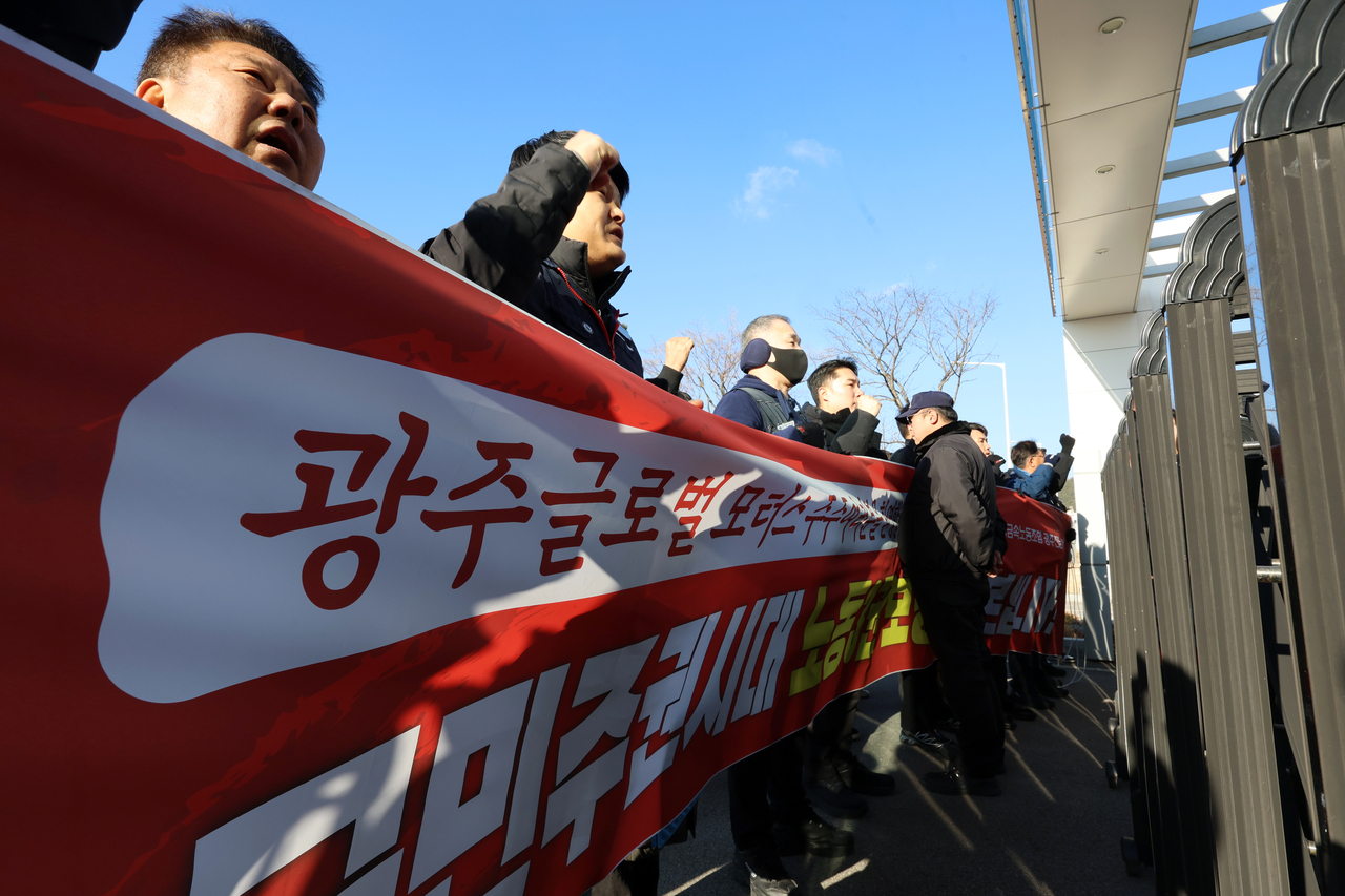 광주글로벌모터스(GGM) 정문 앞에서 노조원들이 윤몽현 대표이사 연임 반대 집회하고 있다. <연합뉴스> |