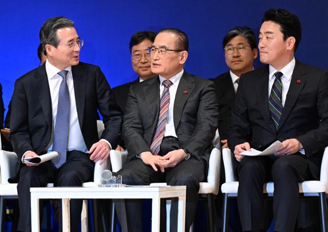 강훈식 대통령비서실장(오른쪽부터)과 위성락 국가안보실장, 김용범 정책실장이 7일 용산 대통령실 대강당에서 '대통령실 6개월 성과 간담회'를 시작하기에 앞서 대화를 나누고 있다. 왕태석 선임기자 |