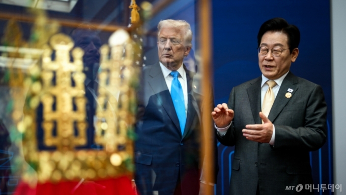 이재명 대통령이 지난 10월29일 국립경주박물관에서 열린 한미정상회담에 앞서 도널드 트럼프 미국 대통령에게 선물할 신라 금관 모형에 대해 설명하고 있다. / 사진=백악관 |