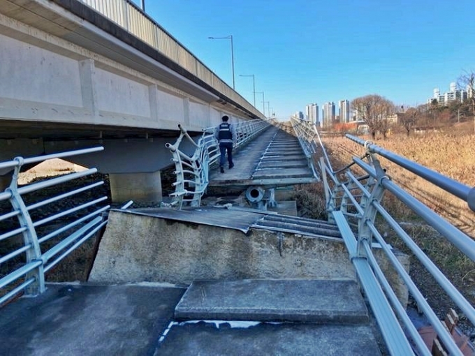 28일 낮 12시10분쯤 광주 서구 광신대교 옆 보행교가 무너져 있다는 신고가 접수돼 당국이 조치했다./사진=뉴시스 |