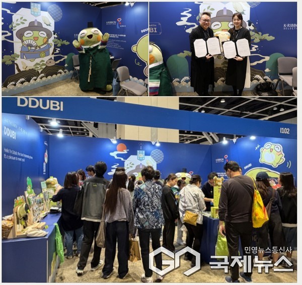 (대구=국제뉴스) 백운용 기자 = 김대권 수성구청장은 "뚜비는 지역의 생태환경 가치를 담은 캐릭터로 출발해, 국가 인증(K-Ribbon)을 거쳐 이제 해외 시장에서 IP로 평가받는 단계에 이르렀다"며, "이에 20일부터 21일까지 홍콩 컨벤션센터(HKCEC)에서 열린 '홍콩 일러스트레이션 크리에이티브 쇼 2025(HKICS 10)'에 참가해, 2025년 우수문화상품(K-Ribbon)으로 지정된 수성구 대표 캐릭터 '뚜비'의 한국 홍보관을 운영하고, 홍콩 에이전시 '오아시스그룹 아시아(OBG)'와 지식재산권(IP) 수출을 위한 MOU(의향서)를 체결했다"고 말했다.