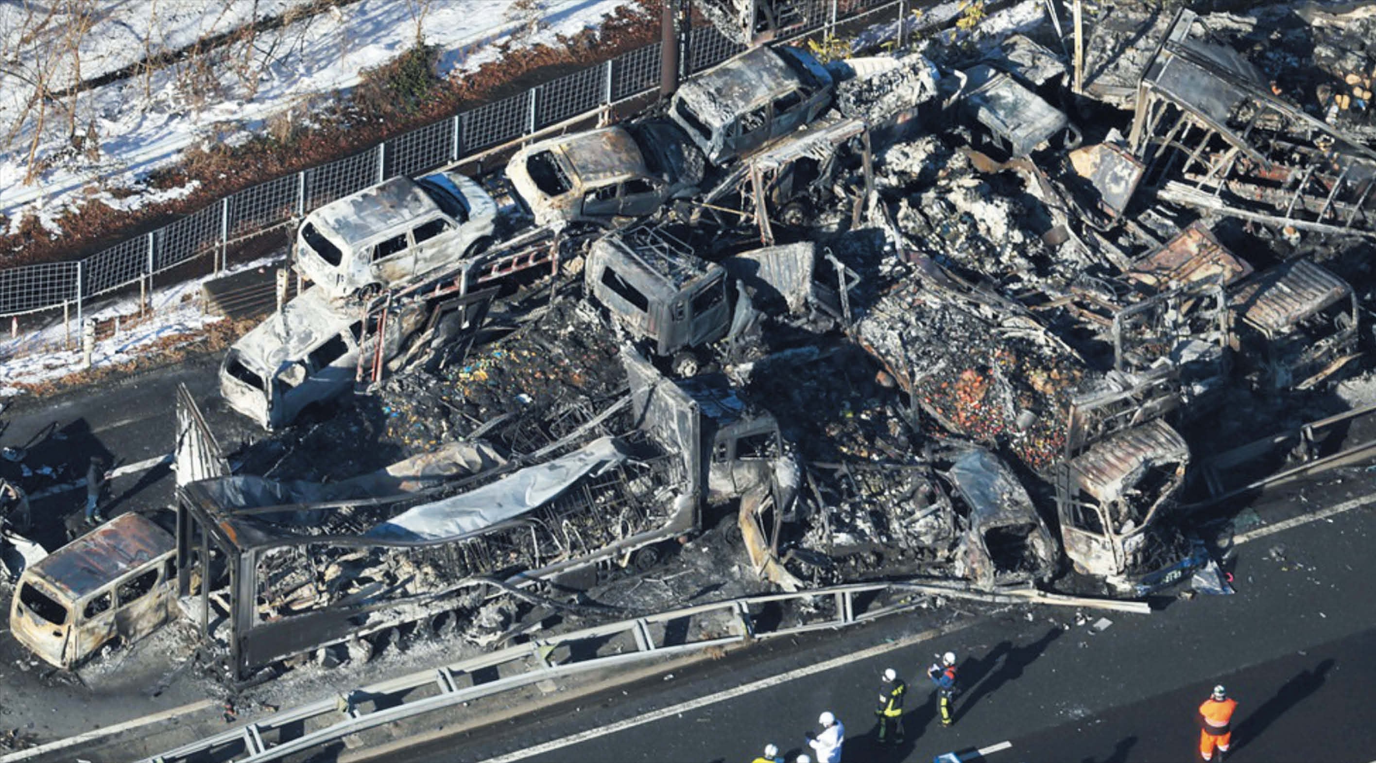 일본에서 폭설로 고속도로에서 차량 67대가 잇따라 부딪히는 대형 연쇄 추돌 사고가 발생했다. 27일 오후 7시 30분쯤 군마현 미나카미마치 간에쓰(関越) 고속도로 하행선 나들목 부근에서 눈길에 미끄러진 트럭 두 대가 먼저 충돌했고, 뒤따르던 차량들이 이를 피하지 못하며 사고 규모가 커졌다. 이 사고로 2명이 숨지고 26명이 다쳤다. 사진은 연쇄 추돌 여파로 폭발이 발생해 차량들이 전소된 모습.