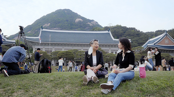 다큐 ‘청와대 건너 붉은 벽돌집’을 연출한 안소연 감독(오른쪽)이 할머니와 함께 청와대를 찾아, 오랜 이웃이지만 범접할 수 없던 곳을 방문한 감회를 나누고 있다. 사진 드림팩트엔터테인먼트 |